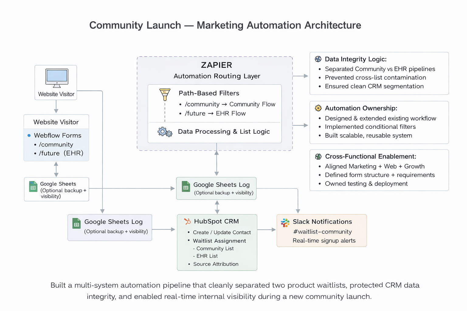 Separated Community and EHR pipelines at the routing level. Prevented cross-list contamination and ensured clean CRM segmentation and reporting.
