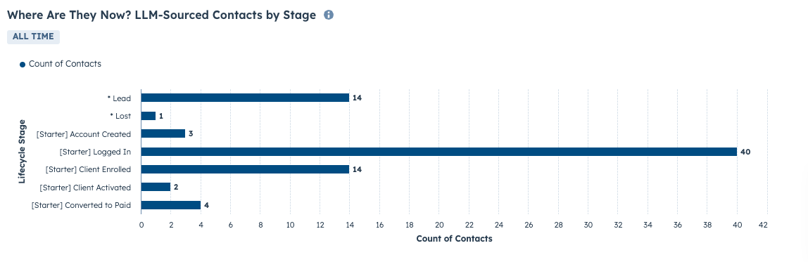 I customized a HubSpot reporting system that tracked LLM-sourced contacts from acquisition through lifecycle and revenue stages.
